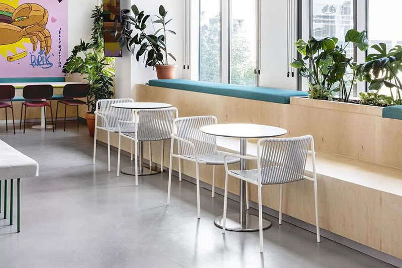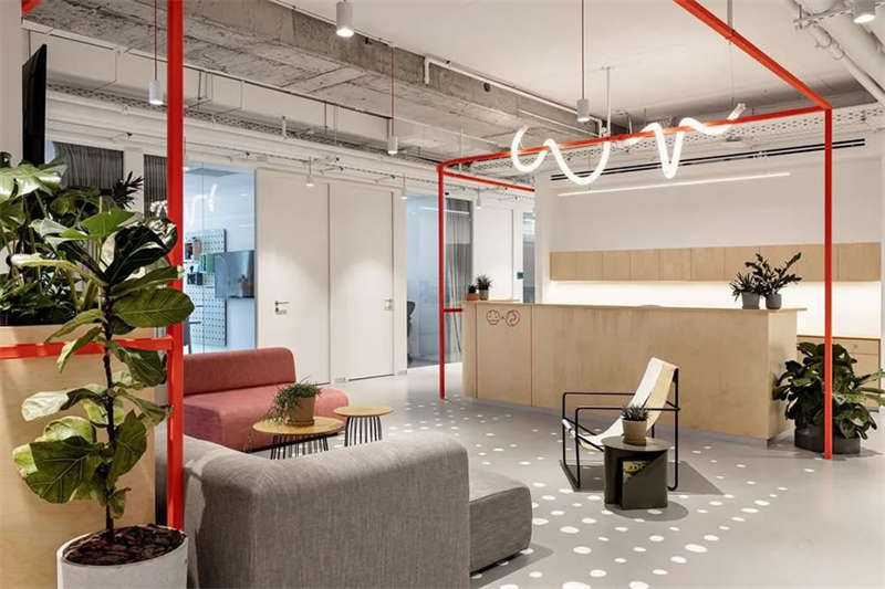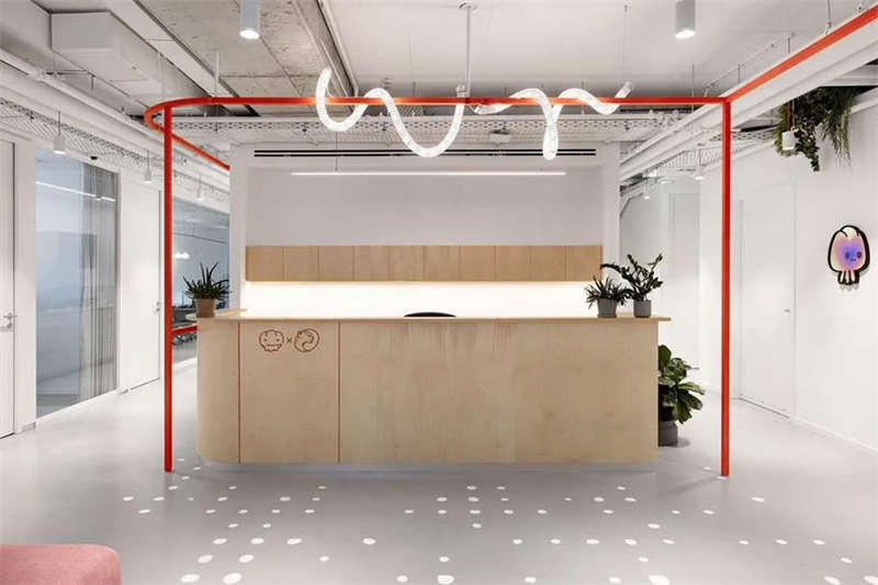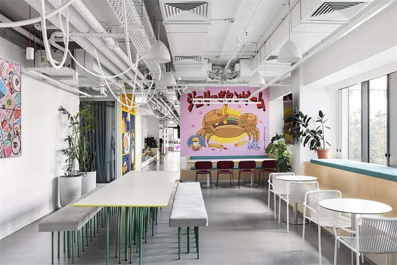 本案的設計出發點旨在創建一個獨特的空間體驗。在以混凝土、裸露的白色天花樓板、綠色植物、天然木材和白色金屬構筑的中性調空間背景中,注入跳躍的色彩和卡通圖形設計去展現其設計理念。