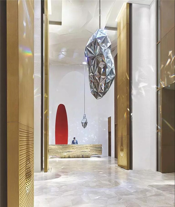 科威特四季酒店從酒店樓頂延伸下來的金屬裝飾吊頂,在燈光的照耀下閃著彩虹般的色彩,灑落在大堂的每一個(gè)角落,大堂的紋理石灰石墻壁延伸至近9米高的天花板。金黃色的固裝家具與灰色空間搭配,形成鮮明對比,猶如現(xiàn)實(shí)與幻想的花園,讓人不由得驚嘆。