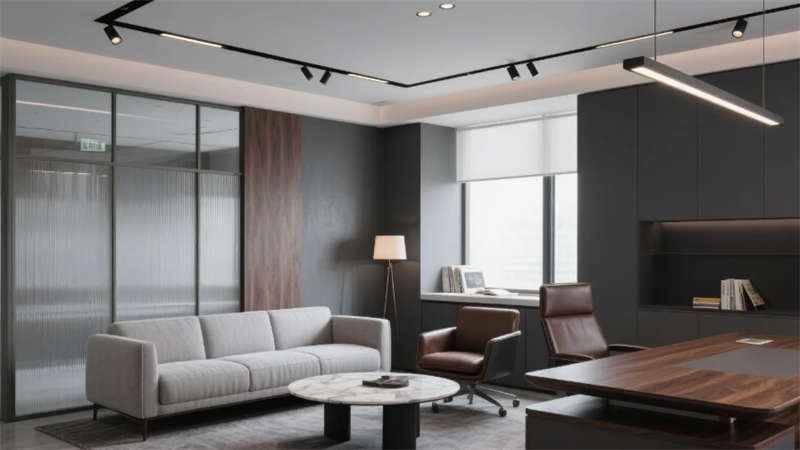 高管辦公區通過灰玻與豎向木紋鋁材構筑半私密空間,L型胡桃木辦公桌與深棕真皮座椅彰顯商務質感,獨立閱讀角的落地燈營造人文氛圍。總裁辦公室運用懸浮式書架墻與黑檀木辦公桌塑造權威感,環形皮革沙發組與天然大理石茶幾構成高端會客場景,日式茶室通過木格柵與洞石墻面實現東西方美學交融。