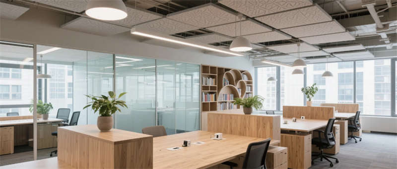 獨(dú)立辦公空間以溫潤(rùn)木質(zhì)包裹私密場(chǎng)域,隱藏式收納與可變形沙發(fā)實(shí)現(xiàn)功能復(fù)合;封閉會(huì)議室通過智能調(diào)光玻璃平衡科技效率與人文溫度,聲學(xué)織物墻面如城市肌理般起伏。社交樞紐咖啡吧保留混凝土原始粗糲感,苔蘚綠植墻與古董吊燈碰撞出工業(yè)浪漫,成為思想交鋒的容器。階梯式報(bào)告廳以水磨石曲面呼應(yīng)合肥山水脈絡(luò),可開合隔斷延展空間維度。