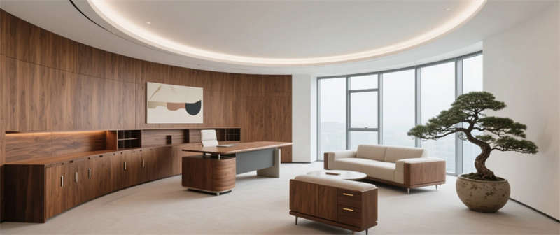 以低飽和度色系為視覺基底,現(xiàn)代極簡(jiǎn)主義與自然生態(tài)理念在此交融,構(gòu)建兼具理性效率與情感溫度的辦公場(chǎng)域。通透的玻璃幕墻將城市天際線引入室內(nèi),前廳接待區(qū)以深褐大理石與抽象金屬裝置傳遞企業(yè)質(zhì)感,垂直綠植墻模糊建筑與自然的邊界。開放式辦公區(qū)以模塊化家具與弧形書架創(chuàng)造靈活動(dòng)線,透明天窗將日光轉(zhuǎn)化為流動(dòng)的創(chuàng)作能量,幾何聲學(xué)板在靜謐中守護(hù)協(xié)作靈感。