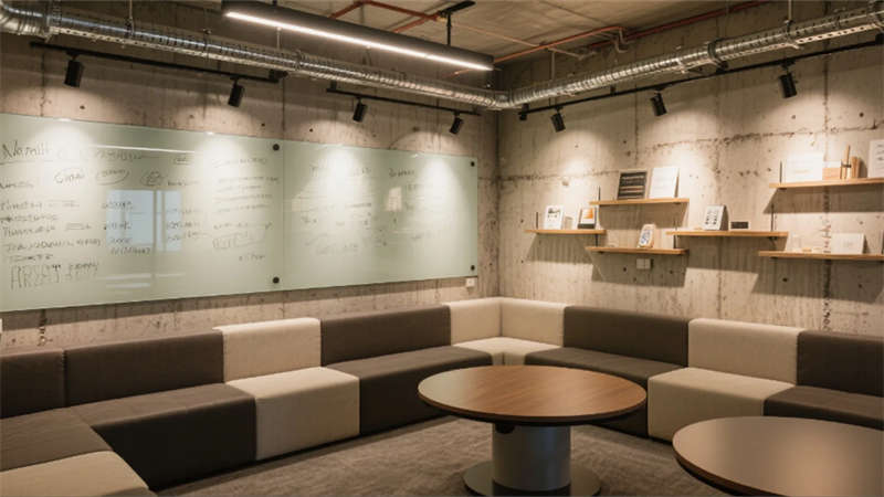 從前臺懸浮木紋臺面的企業標識,到開放式工位可變的模塊化組合,空間始終保持著“未完成”的進化基因。頭腦風暴區的可書寫玻璃墻記錄著思維軌跡,階梯培訓區的滑軌電源系統隨需求生長,智能會議室霧化玻璃在透明與私密間自由切換,專注電話艙的磨砂質感包裹著獨立思考的靜謐。高管辦公室的皮質座椅與垂直線條燈帶,隱喻著決策的柔韌與果決,而咖啡區黑板墻的手繪痕跡,則讓機械齒輪般的空間有了呼吸的節奏。