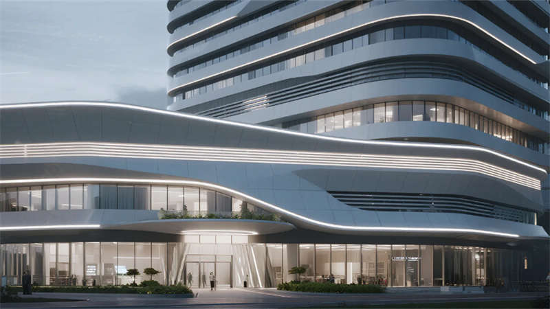 本設計呈現一處現代企業總部空間,將科技感、生態理念與極簡美學完美融合。建筑外立面以銀灰與淺白為主調,標志性的流線型玻璃幕墻反射柔和天光,橫向啞光金屬線條勾勒出精致輪廓。主入口挑高設計配以通透落地玻璃,底部巧妙融入垂直綠植墻或淺灰色光伏玻璃,日間展現科技冷靜,夜間透出均勻溫暖光暈,周邊簡潔綠植景觀呼應生態主題。