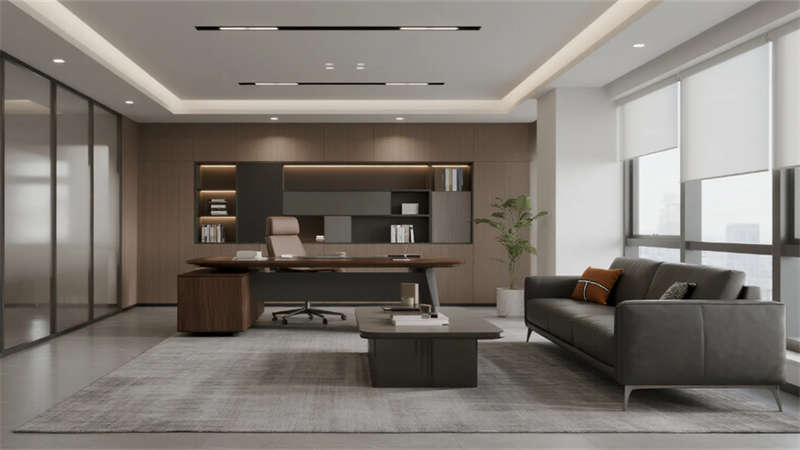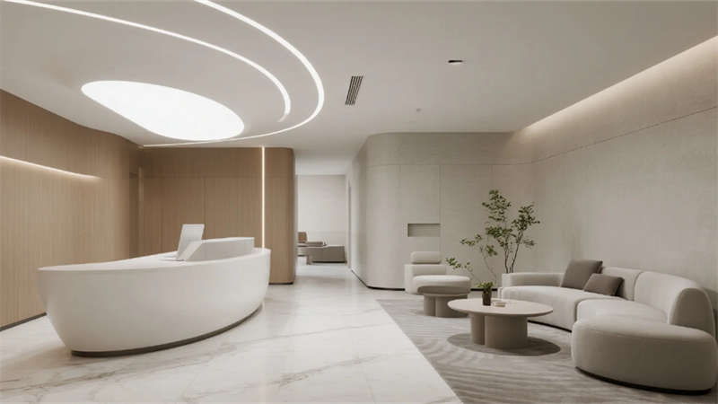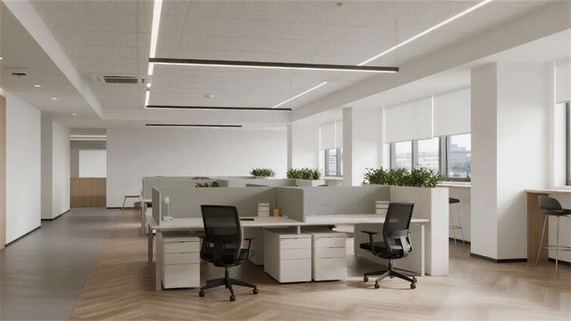 內部空間延續外部的純凈氣質。企業大堂以淺白色大理石地面與溫潤木紋墻面奠定基調,弧形純白前臺點綴深藍企業標識,懸浮線性燈光延伸視覺。右側等候區模塊化沙發與綠植盆景營造舒適氛圍,左側數字影像墻動態展示企業風采,淺灰肌理漆背景墻在隱藏燈帶映襯下更顯質感。開放式辦公區強調高效與靈活,白色穿孔吸音天花下,淺灰可升降桌與黑色人體工學椅組合排列,協作島與窗邊高吧臺滿足多元需求,淺木紋PVC地面增添自然暖意。高管辦公室運用灰玻隔斷與電動霧化膜保障私密,胡桃木辦公桌、深灰皮質沙發與嵌入式書柜彰顯沉穩,無主燈設計營造專注氛圍。公共支持區模塊化吧臺、淺木紋儲物柜與智能文件柜集成高效服務,細節處的綠植點綴延續生態關懷。整體設計從外至內,以統一的色調、考究的材質與智能化細節,塑造出體現合肥創新精神的智慧辦公新標桿。