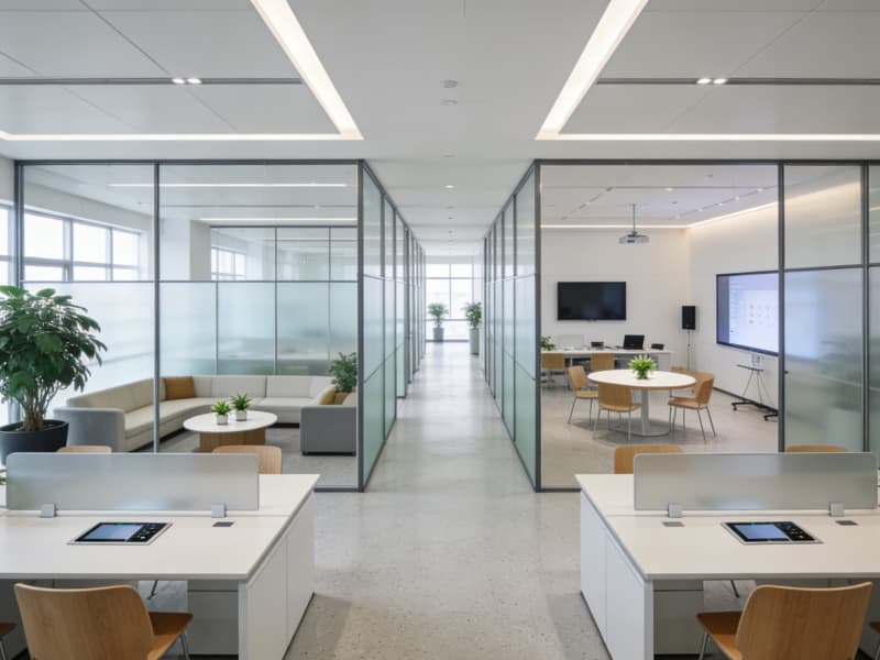 研發(fā)辦公區(qū)強調(diào)創(chuàng)新與協(xié)作氛圍,開放式的辦公空間采用靈活的隔斷設(shè)計,可根據(jù)團隊需求自由組合。辦公桌配備智能充電與數(shù)據(jù)接口,方便員工使用電子設(shè)備。會議室配備先進的多媒體展示與視頻會議系統(tǒng),滿足跨地區(qū)的研發(fā)交流需求。辦公區(qū)還設(shè)置了休閑討論區(qū),擺放著舒適的沙發(fā)與茶幾,搭配綠植,為員工提供放松與交流創(chuàng)意的空間。