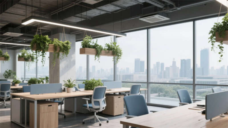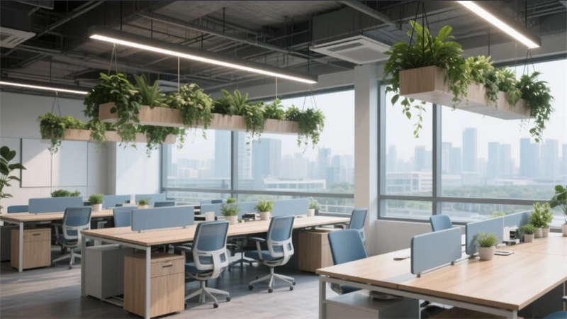 該辦公空間以"自然共生"為核心理念,將科技感與人文溫度融入兩千平米的開放場域。流動的淺木色調(diào)貫穿始終,啞光金屬與微水泥形成質(zhì)感對話,模塊化家具構(gòu)建靈活場景。綠植生態(tài)系統(tǒng)從空中吊籃蔓延至苔蘚墻面,模糊室內(nèi)外界限。