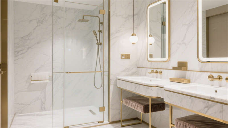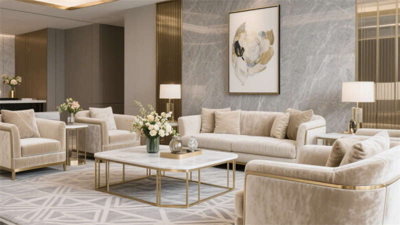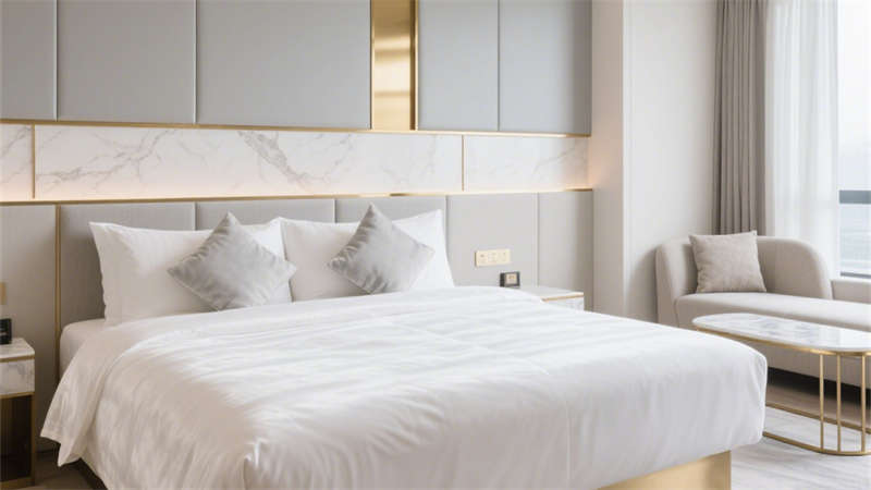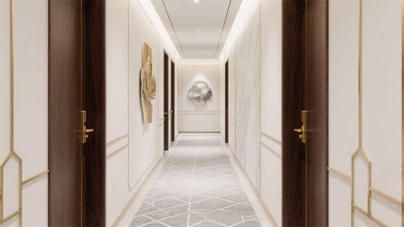 本設(shè)計以輕奢風(fēng)格為核心,通過柔和的基底色調(diào)與精致的細節(jié)搭配,構(gòu)建出兼具質(zhì)感與舒適度的酒店環(huán)境。空間以米白色與淺灰色為基礎(chǔ),巧妙融入金色金屬線條作為點綴,既避免了過度奢華的厚重感,又增添了空間的精致度。墻面與地面選用細膩的大理石紋理材質(zhì),在光線映襯下呈現(xiàn)出自然的光澤,提升整體空間的高級感。家具選型注重線條的簡約流暢,搭配柔軟的布藝軟裝,營造出溫馨舒適的居住氛圍。各個區(qū)域在設(shè)計上保持風(fēng)格統(tǒng)一,從公共空間到客房區(qū)域,都延續(xù)了輕奢的設(shè)計語言,讓整體空間既富有格調(diào),又能給人帶來放松愜意的居住體驗。