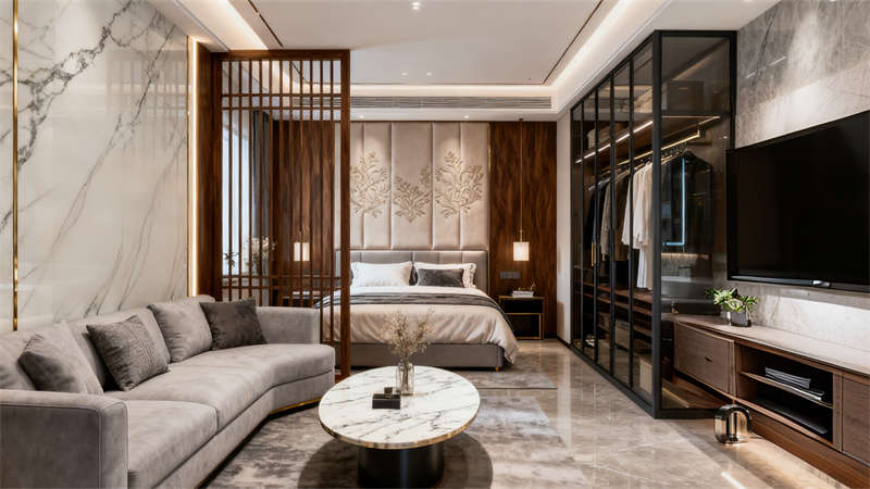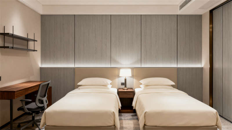 本設(shè)計以現(xiàn)代輕奢為核心風(fēng)格,為蚌埠這家酒店打造出兼具質(zhì)感與溫度的居住體驗。整體空間以低飽和的米灰色系為基底,搭配胡桃木的溫潤與金屬線條的精致,構(gòu)建出統(tǒng)一且富有層次的視覺效果。?