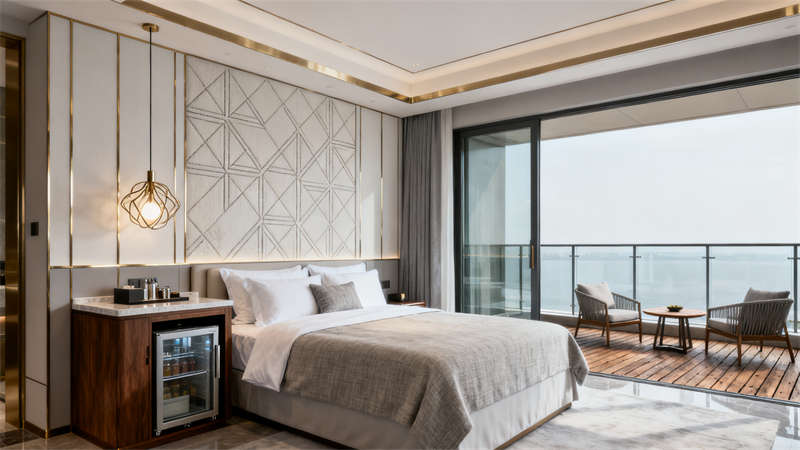 公共區(qū)域與客房保持風(fēng)格一致,從外觀的玻璃幕墻與石材拼接,到室內(nèi)大堂的胡桃木格柵背景墻、餐廳的金屬框架與大理石臺面,每一處細(xì)節(jié)都延續(xù)了現(xiàn)代輕奢的設(shè)計語言。軟裝選擇上,莫蘭迪色系的抱枕、暖橘色的點綴,以及自然綠植的融入,為空間增添了溫馨感,讓整體裝修既顯精致格調(diào),又避免了冰冷生硬,全方位提升了酒店的居住與體驗質(zhì)感。?