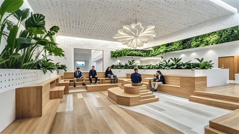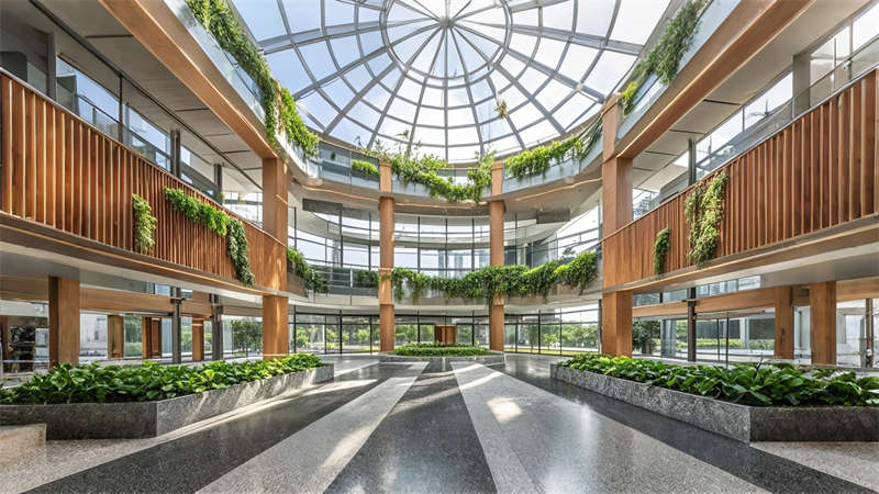1)中庭三層挑空綠植墻構建垂直生態系統,改善室內空氣質量;