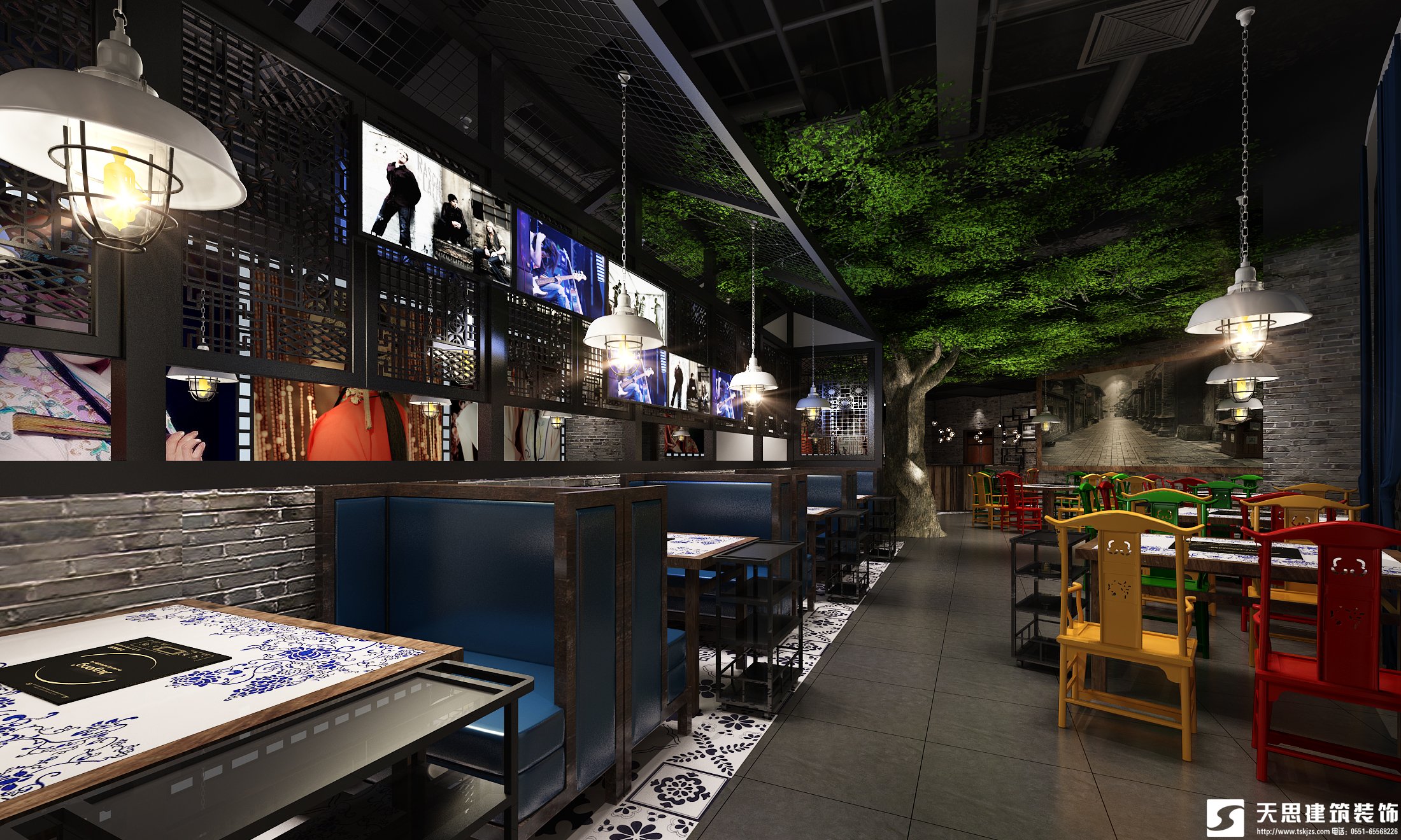 天思裝飾在為火鍋店進行地面施工改造過程中,即采取了混合設計法,區分不同區域進行不同設計,并將各個區域通過裝飾手段協調成為一個整體,并不會因為不同的施工材料和工藝造成視覺上的不統一。