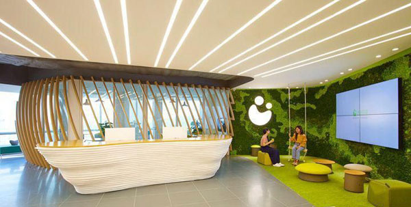 木制材質(zhì)頂板加上錯(cuò)綜非規(guī)則紋路的前臺(tái)造型,再搭配綠色樹林墻身、秋千以及俏皮創(chuàng)意的蘑菇凳,讓前臺(tái)充滿了既視感。這不再是一個(gè)單純的辦公室,而是一個(gè)可以自由舒適徜徉其中的樂園。