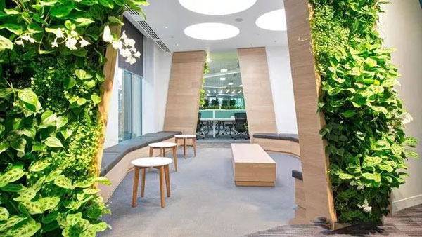 小編認(rèn)為最有趣的是傾斜感的墻體圍合出的相對獨立的休閑區(qū),入口兩側(cè)是繁茂的垂直綠植裝飾讓這里別有洞天。開敞的落地玻璃窗讓這里滿室生輝,手捧一杯醇香的咖啡坐在窗邊是何等的心曠神怡,活力滿滿!