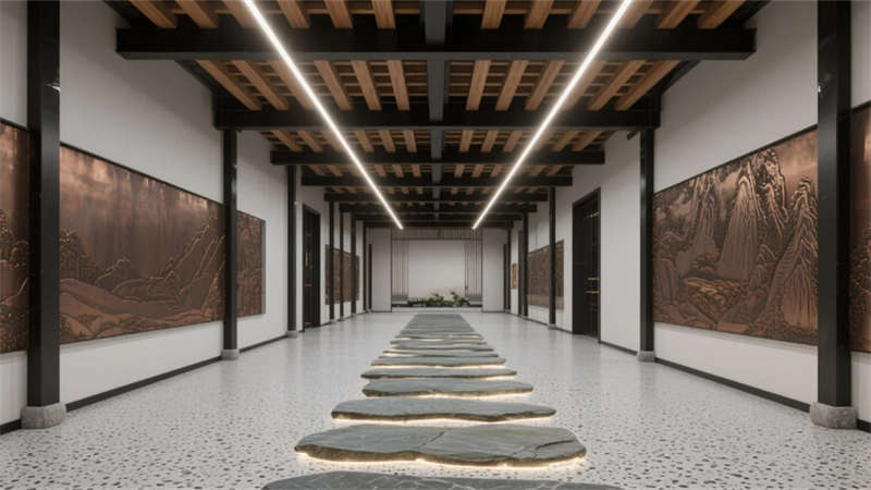 前臺大廳成為文化凝練的序章:層疊銅藝山形墻在光暈中起伏,夯土臺面與懸浮木構的碰撞隱喻傳統與未來的對話。紙膜藝術燈如空中浮云,柔化工業風的冷峻基調。