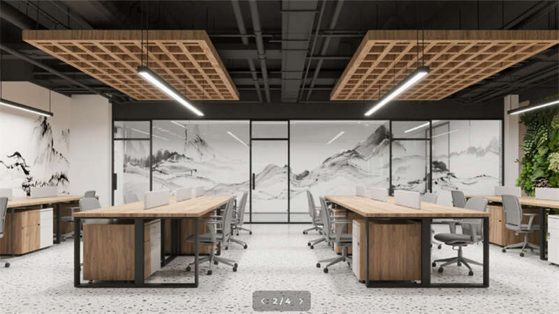 空間脈絡延續山水哲學——開放式辦公區的水墨玻璃隔斷營造朦朧畫境,創想實驗室可書寫墻面激發思維奔流。協作沙龍區的階梯布局與動態山水投影,催化靈感迸發的化學反應。靜思艙藏身綠植墻中,為深度思考保留秘境。