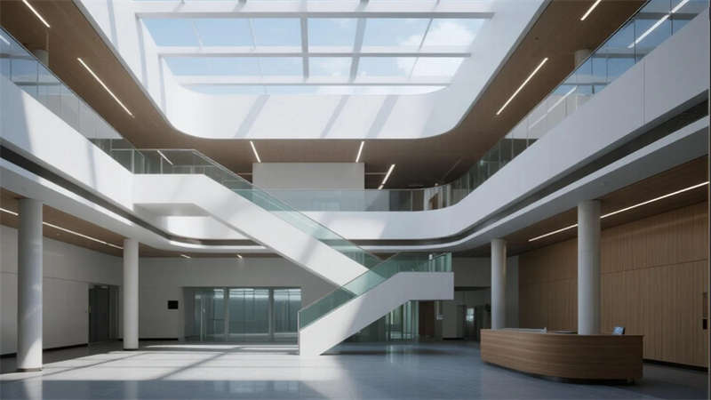 空間內(nèi)核強(qiáng)調(diào)人性化體驗:挑高中庭以懸浮樓梯創(chuàng)造輕盈動線,屋頂花園成為員工觸摸自然的窗口;無柱車間與智能實驗室展現(xiàn)工業(yè)精密感,而木格柵連廊與綠植墻則注入人文溫度。夜幕降臨時,建筑化為光影容器,冷白光帶勾勒結(jié)構(gòu)輪廓,暖黃窗格透出工作場景的活力。
