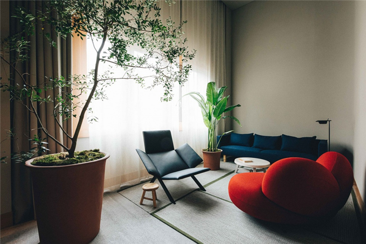 酒店的客房同樣色彩斑斕。客房的開放空間中央立有大型紗柱,懸掛著自然染色的靛藍(lán)色漸變織物。客房空高開闊,四周擺設(shè)有CKR設(shè)計(jì)的沙發(fā),皮革躺椅及一系列盆栽裝飾。同時(shí),房間內(nèi)配有唱片機(jī)及精選的黑膠唱片,為房間帶來了親切感。房間內(nèi)的照明采用特別設(shè)計(jì)的燈具,其中以定制的紙質(zhì)燈最具特色。此外酒店客房,套房及復(fù)式套房中,都采用了紡織品裝飾的定制雙人沙發(fā)。