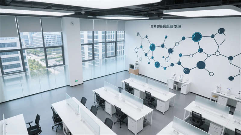 物流中庭的挑空設(shè)計(jì)打破廠房尺度壓迫感,懸掛式數(shù)據(jù)看板如抽象藝術(shù)品,與玻璃穹頂投下的天光共構(gòu)科技禪意。研發(fā)區(qū)可移動(dòng)實(shí)驗(yàn)裝置墻體現(xiàn)柔性生產(chǎn)理念,分子結(jié)構(gòu)藝術(shù)墻繪暗喻制造背后的科學(xué)探索。