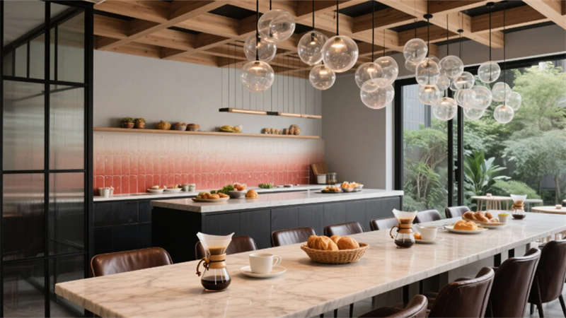 全日餐廳以陶土色格柵天花呼應徽州傳統工藝,吹制玻璃吊燈如晨露凝結空中;宴會廳則化身未來劇場,波浪形織物天花與全息投影幕布共舞光影。行政樓層的商務休息區,深灰毛氈墻面與古銅金屬細節沉淀出理性優雅,窗外綠意透過玻璃隔斷滲入交談空間。從屋頂無邊泳池俯瞰,建筑與巢湖的瀲滟水色遙相呼應,于繁華處開辟一方隱逸凈土——這里不僅是居所,更是一場喚醒感官的設計敘事。