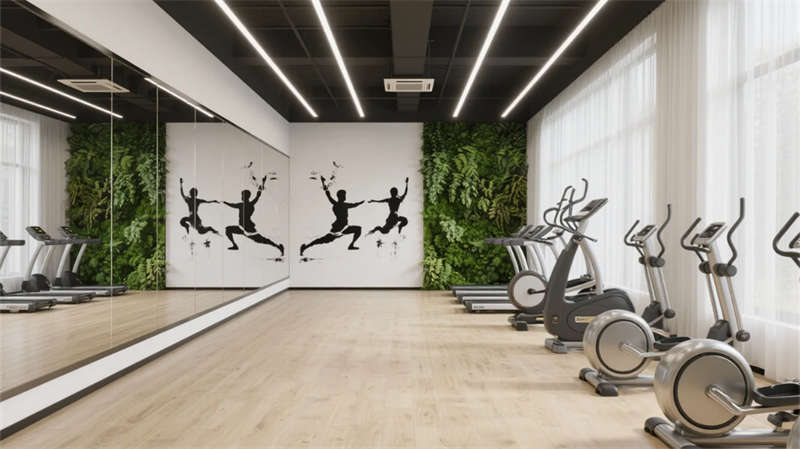 健身區與會議室平衡功能與美學,金屬器械融入水墨肌理,會議長桌呼應胡桃木的溫潤質感。整體設計弱化邊界,讓光、影、材質在流動中對話,為合肥注入一處隱于城市的東方精神綠洲。