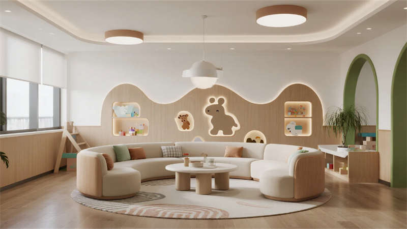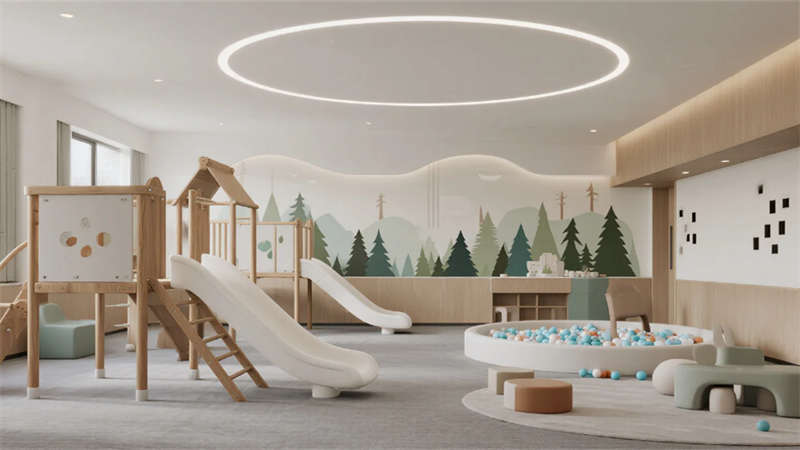 公共區(qū)域強調(diào)功能與美學的平衡:開放式游樂區(qū)釋放孩子天性,閱讀角的樹洞書架激發(fā)想象力,手工坊的彩虹收納系統(tǒng)培養(yǎng)創(chuàng)造力。戶外庭院融入沙坑與綠植,讓自然成為游戲場;夜晚的星空影音室則轉(zhuǎn)為家庭溫馨劇場。整體設(shè)計通過流動的空間布局,讓家長與孩子在簡約美學中共享親密時光,重新定義合肥親子度假的體驗方式。