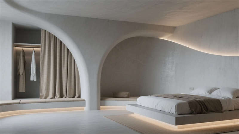 衛(wèi)浴空間化身立體水景容器,鏡面天花反射青石浴缸與垂吊綠植,形成虛實(shí)交織的自然劇場(chǎng)。所有構(gòu)件皆服務(wù)于居者與環(huán)境的對(duì)話,混凝土墻體在晨昏光線中呈現(xiàn)不同肌理,定制家具的圓弧收邊柔化現(xiàn)代主義的冷冽。
