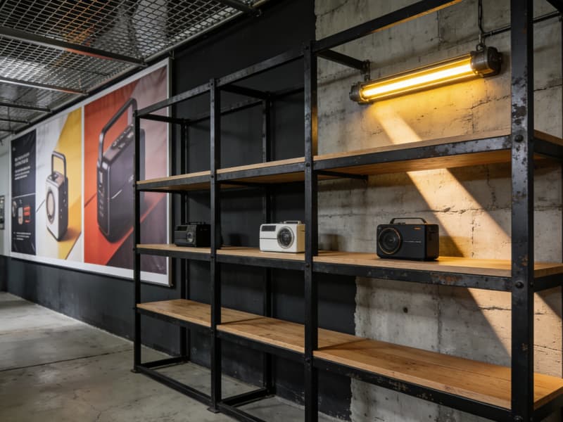 產品展示區則打破傳統廠房的單調,采用木質與金屬結合的展示架,背景墻以大幅的產品海報裝飾,營造出專業且具吸引力的展示空間。