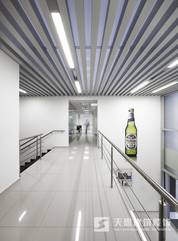 過道好似云梯,潔白的空間給人一種別樣的感覺,讓空間不在單調,大大的啤酒瓶鑲嵌在空間的白墻上,既做為點綴,同時也作為企業的品牌宣傳。