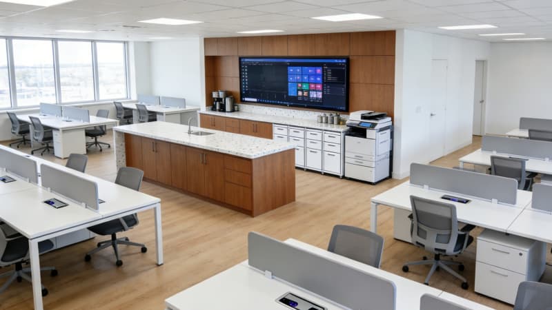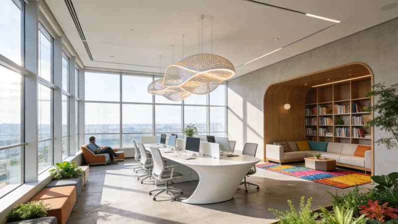 在色彩運(yùn)用上,選用灰白色系為主體,搭配木色與綠色作為點(diǎn)綴。灰白色調(diào)體現(xiàn)工業(yè)的簡(jiǎn)潔與冷靜,木色帶來(lái)自然溫暖的氛圍,綠色則呼應(yīng)黃山的自然生態(tài),為空間注入生機(jī)。材料選擇注重質(zhì)感與功能性,如金屬、玻璃、混凝土與木材的結(jié)合,展現(xiàn)現(xiàn)代工業(yè)的質(zhì)感與自然材料的親和。