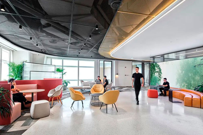 不同于投資公司的傳統(tǒng)形象,設(shè)計師以一個圓島吧臺和開敞的自由交流區(qū)作為前廳接待場所。大量的自然光涌入室內(nèi),明凈開闊。天花地面是圓轉(zhuǎn)流動的曲線造型,采用水磨石地面、金屬網(wǎng)天花、Bolon塑膠地毯等各種新環(huán)保材料,輔以色彩鮮麗的多功能家具組合、大型LED屏和隨處點綴的綠植,呈現(xiàn)出年輕、現(xiàn)代、科技而又充滿能量的生命氣息。