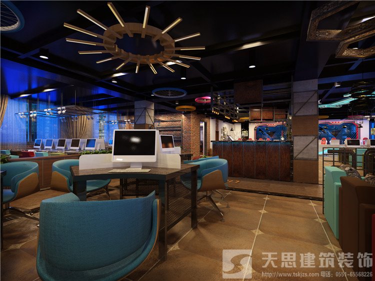3、網咖的設計應該涉及到每一個點、線、面,保證每個地方都沒有疏漏,還要突出與眾不同的個性化特點。比如墻面可以做大型噴畫和網咖LOGO,或噴涂成符合網咖裝飾格調的顏色,保證網咖整體視覺的大氣和舒適。