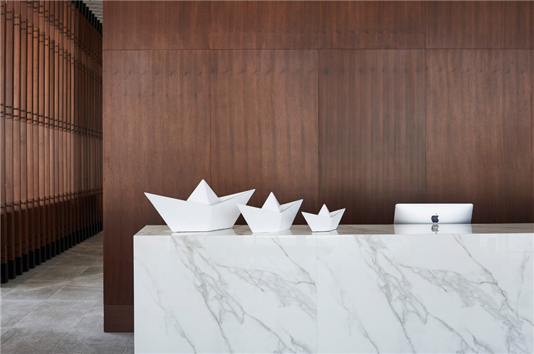 大堂和餐廳的內部特色是光滑的白色石膏墻壁、大理石、黃銅和深色的木材家具。這里用了一個白色,純凈,簡單的立面,走進里面,仍然會感覺到白色,但同時我們使用了一些其他的材料。所有的顏色都來自真實的材料,讓你進入室內時更溫暖。