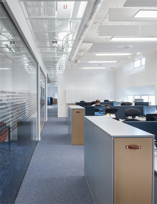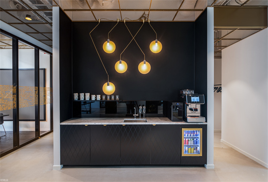 時尚與藝術并存的辦公室設計案例:整個空間設計手法簡約,原有建筑構造和設備管線都展露無遺,色彩的巧妙構筑讓這處極簡loft風的辦公環境充滿了時尚的活力氛圍。墻面上充滿活力的圖案和一張乒乓球桌是視覺中的主角,而主入口就在這里。這里沒有傳統的接待臺,訪客進入辦公室,可以為自己沖杯咖啡,然后進入到內部空間。入口處設有員工更衣室。辦公室的中央是一處大型演講廳,也是主要的活動場所。多功能演講廳配有看臺式階梯座、咖啡吧、屏幕和投影儀、講臺和所有其它必要的設備,即可以舉辦研討會、各種宣講,也是一處極為舒適的聚會場所。空間內的照明設計非常獨特,采用了網格狀的矩陣布局,將所有燈具串聯在一起,形成精致的美學效果。整個空間形成一個明亮的背景,襯托出有趣的設計細節和墻面圖形設計。