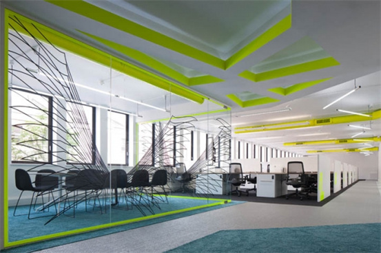 時尚辦公室裝修設計:以白色為空間主調,加入充滿活力的顏色,如霓虹黃色頂面線槽、以及柔軟的綠松石色地毯點綴在灰與黑色地毯間。裸露的頂面管道噴涂以同樣的黃色;每一組工位都以醒目的霓虹黃色字母加以標識。空間的其它色彩以中性色加以調和,以免跳躍的霓虹黃色太過強烈刺激。會議室的玻璃隔墻,上面繪制了一系列的天使(Angel)翅膀圖形,為密集的辦公區增添了豐富的視覺效果。休閑區與辦公區之間一道纏繞于金屬管道之間的紅色Z字型隔屏,活躍了空間色彩。設計師以清新簡約的空間配色,打造了一個開敞明亮、且獨具個性特色的時尚辦公室。