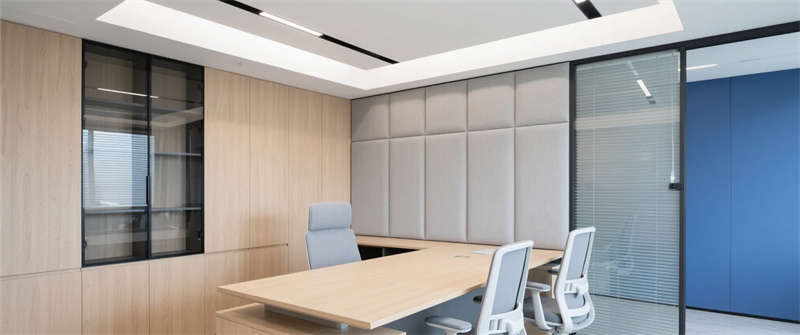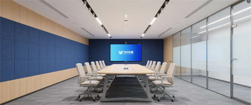 • 智能會議室:深藍色吸音墻面呼應(yīng)企業(yè)VI色,智能屏幕與玻璃隔斷凸顯科技屬性;