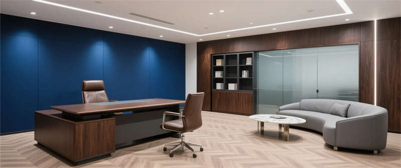 • 總裁辦公室:人字拼木地板與深胡桃木家具提升質(zhì)感,深藍藝術(shù)漆背景墻強化品牌識別;