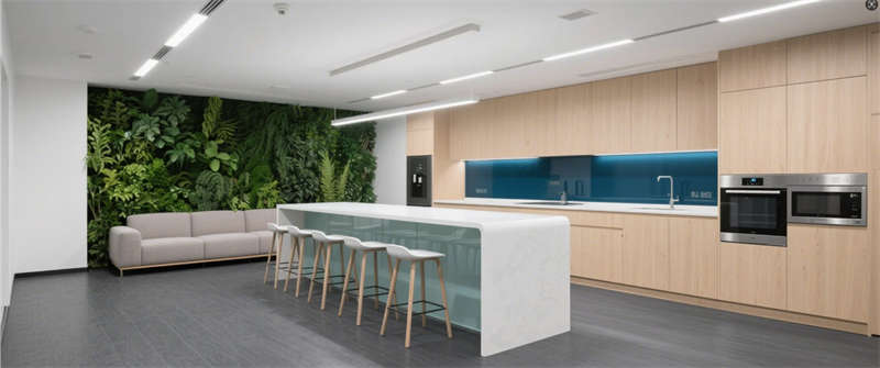 • 休閑茶水間:白色吧臺與綠植墻營造松弛氛圍,地膠材質(zhì)耐磨易清潔。